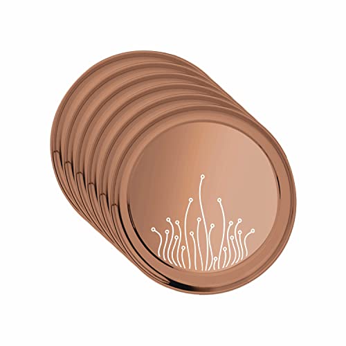This comprehensive dinner plates set showcases tribal Gond art motifs with a stunning rose gold PVD coating. The collection includes complete serving essentials: 6 full plates, 6 quarter plates, 18 katoris, serving bowls, cutlery, and accessories—ideal for those who entertain frequently or prefer coordinated tableware.