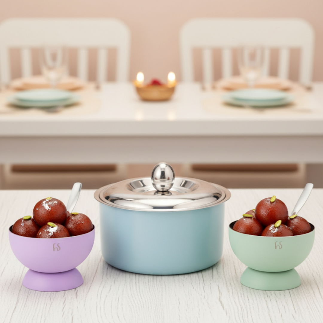 Upgrade your dining with this elegant FnS stainless steel set. The 850 ml mirror-finish casserole keeps food hot and fresh, while the 6 bowls with spoons are perfect for ice cream, snacks, or desserts. Made from premium, food-grade stainless steel, the set is durable, rust-resistant, dishwasher safe, and easy to clean. Ideal for everyday meals, parties, housewarming gifts, or festive occasions.From designer cutlery to stainless dinner sets, explore our luxe range of bestsellers loved by all!